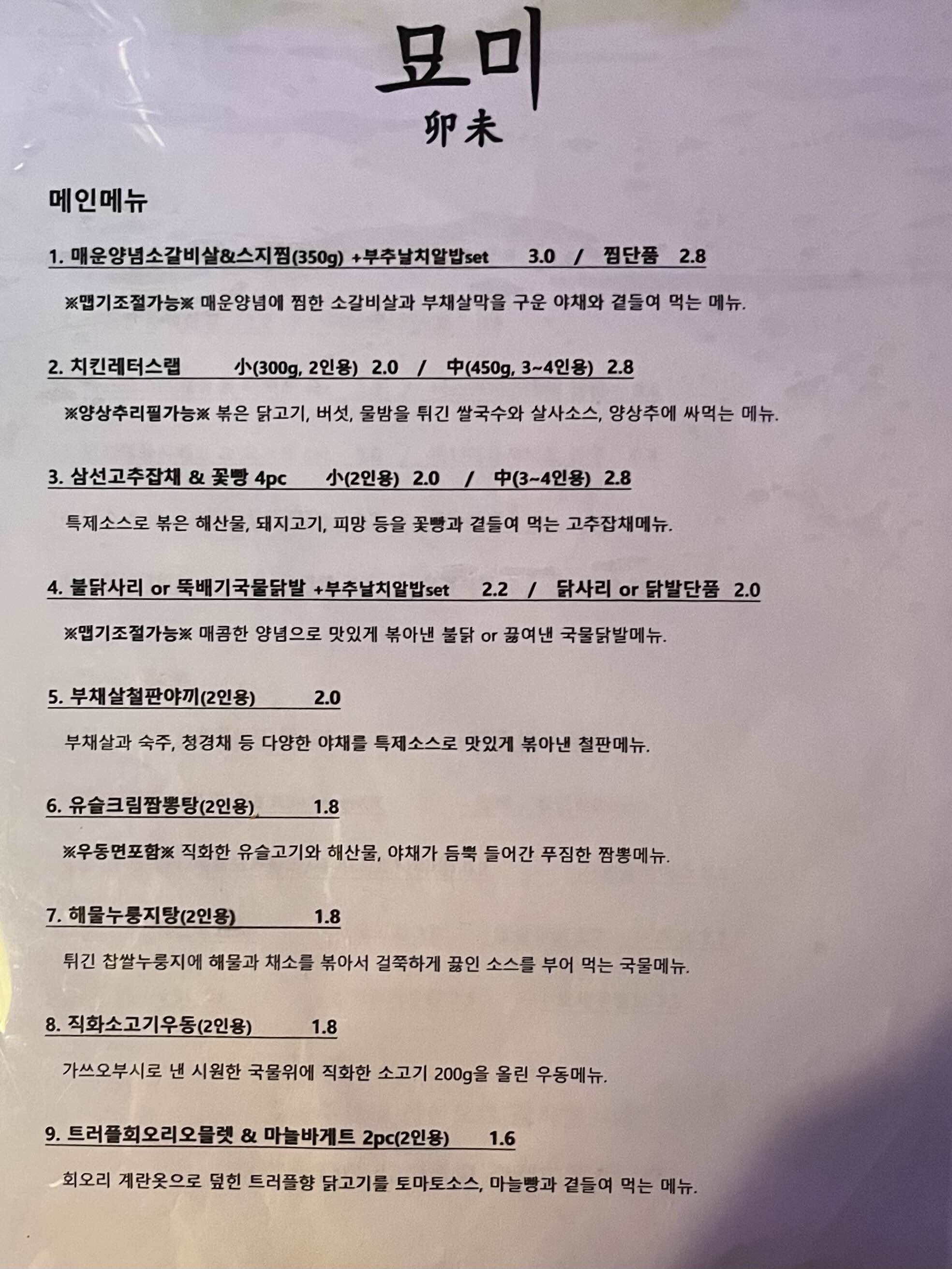 원주 봉화산택지 「묘미」 메뉴 및 리뷰