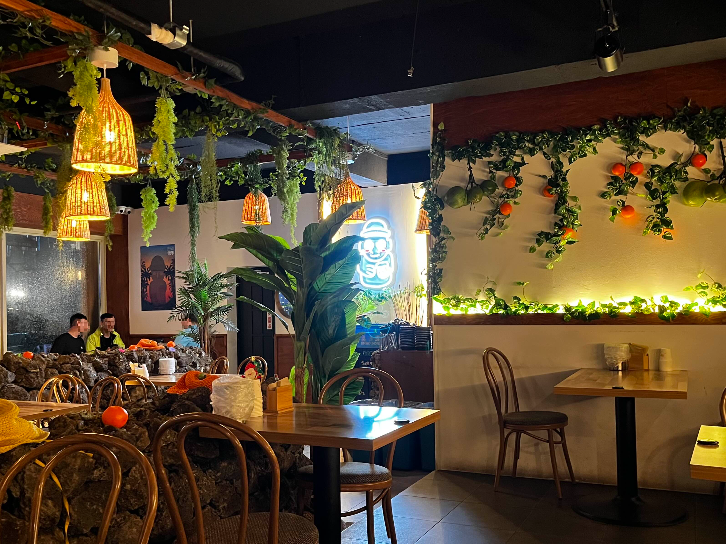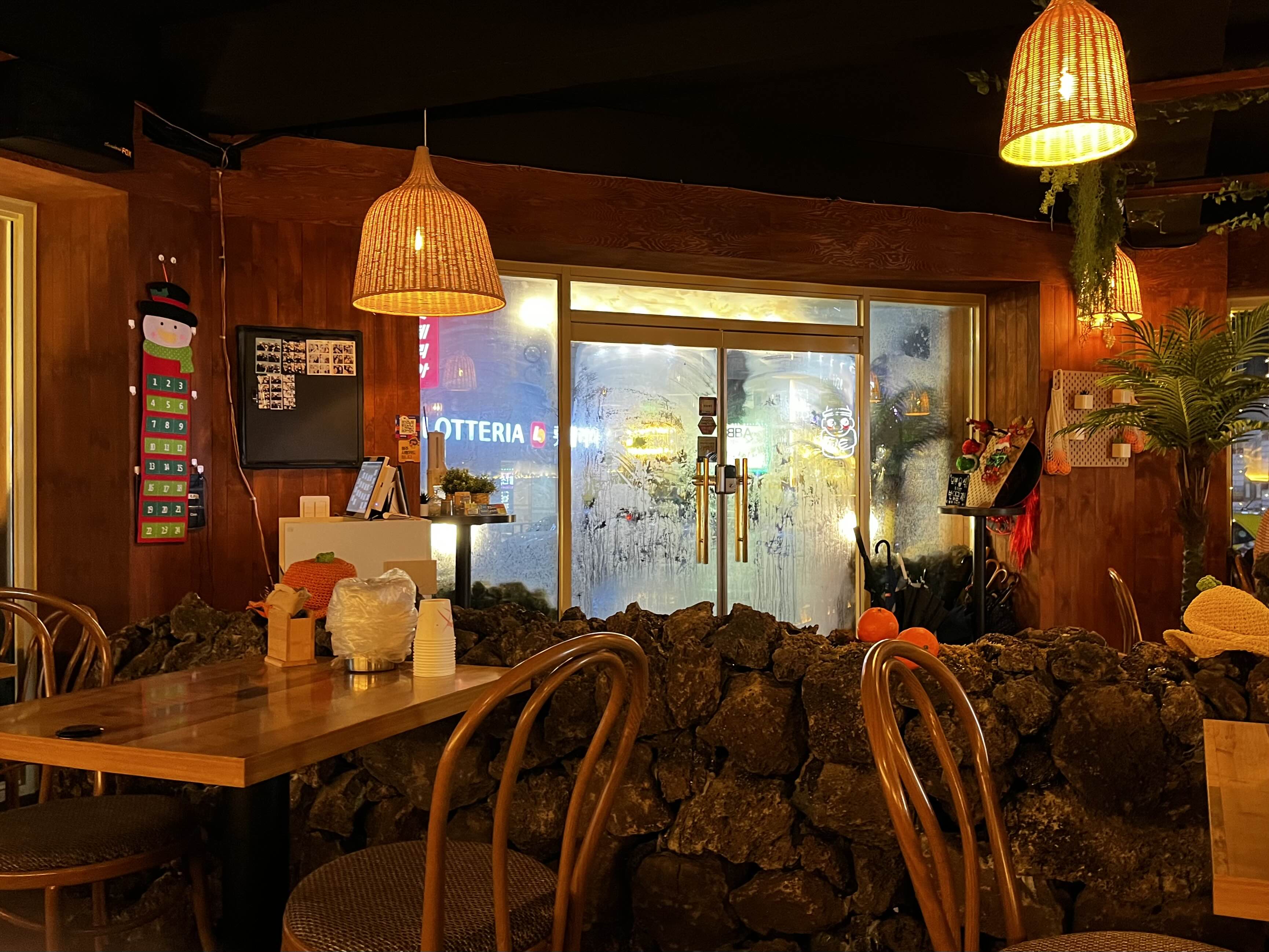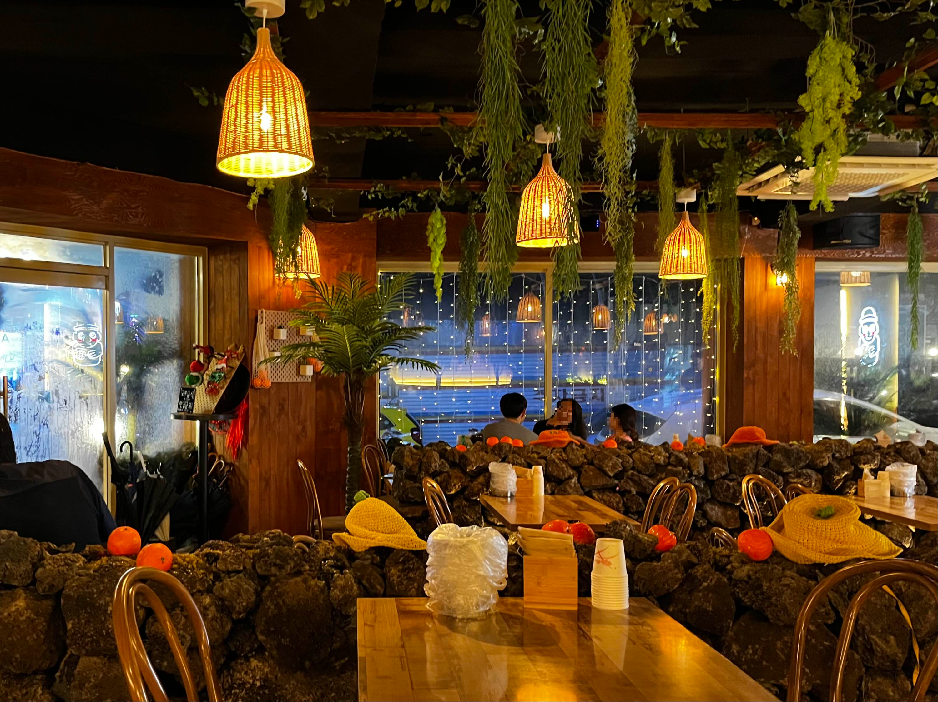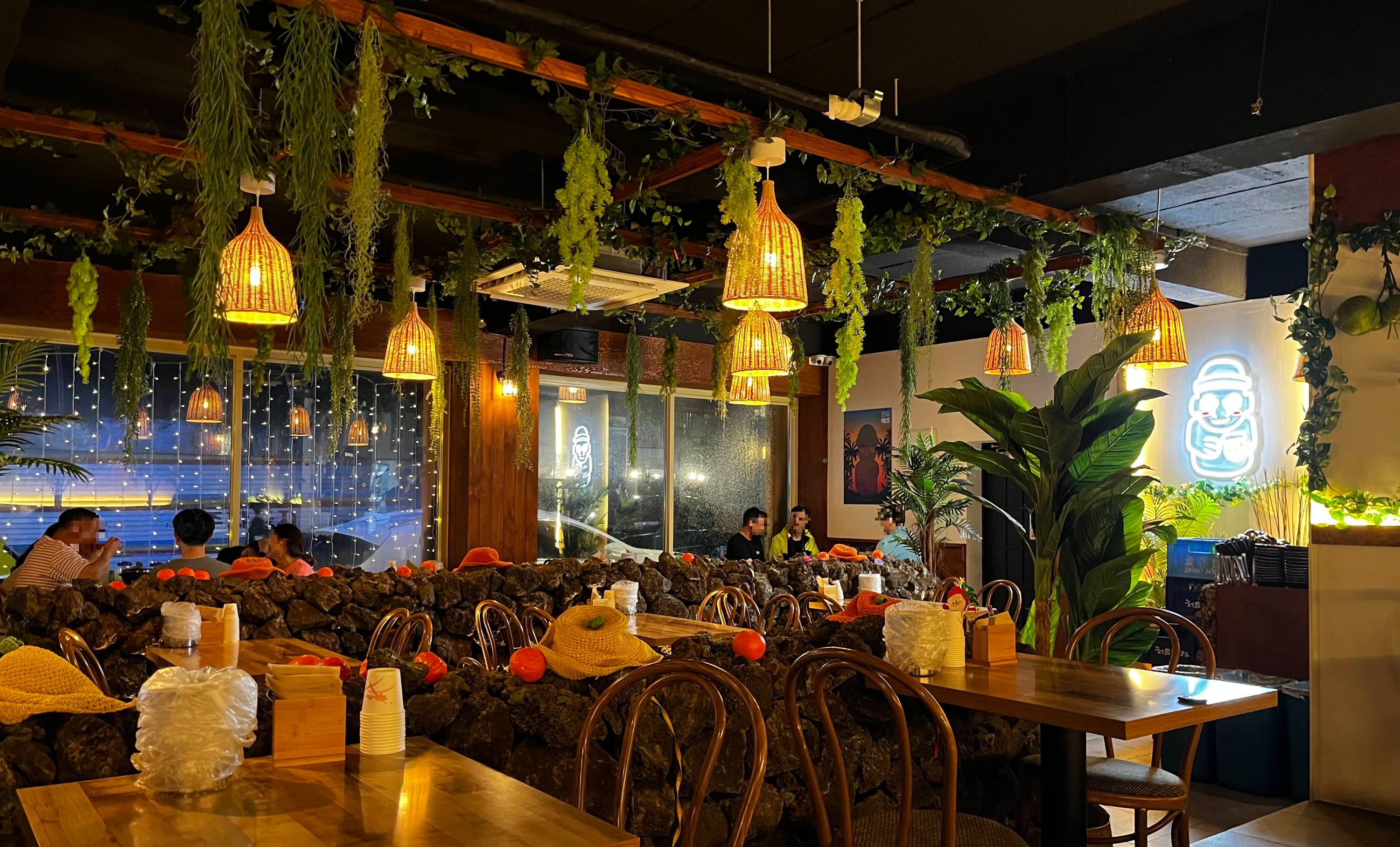 낮은 제주의 현무암 돌담 스타일로 인테리어되어 있습니다