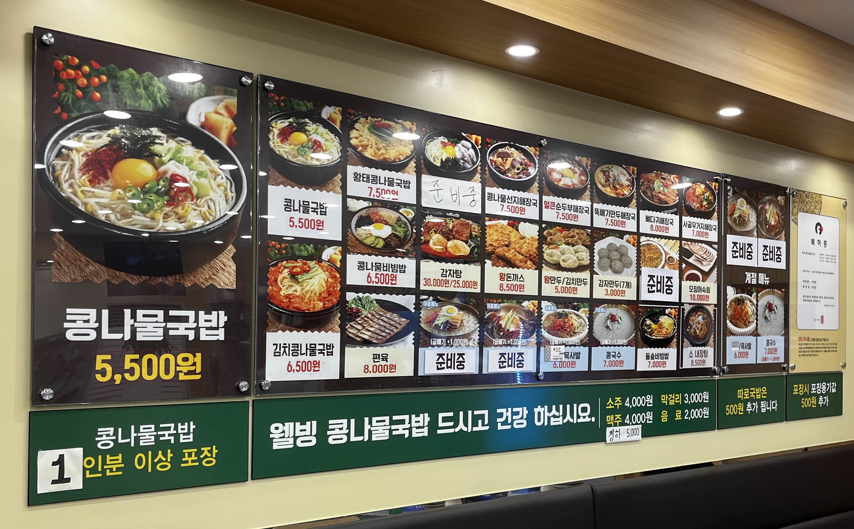 콩나물 비빔밥, 감자탕, 돈가스, 순두부 해장국 등등