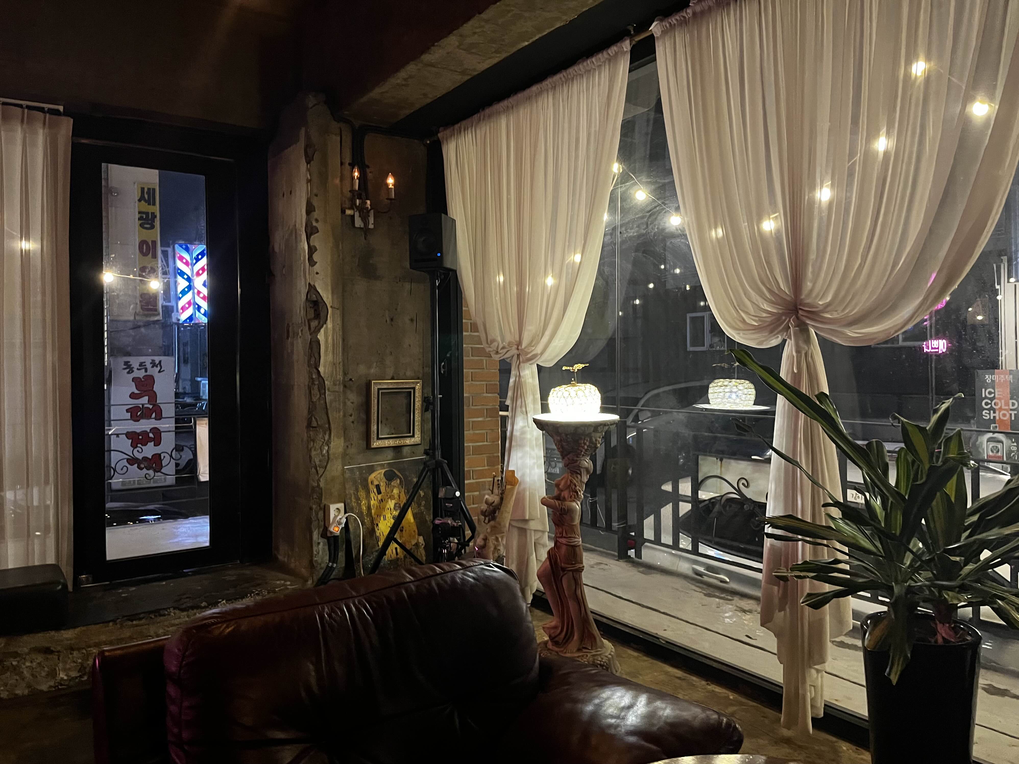 실내는 어둡지만 인테리어 조명이 곳곳에 환하게 켜져 있어