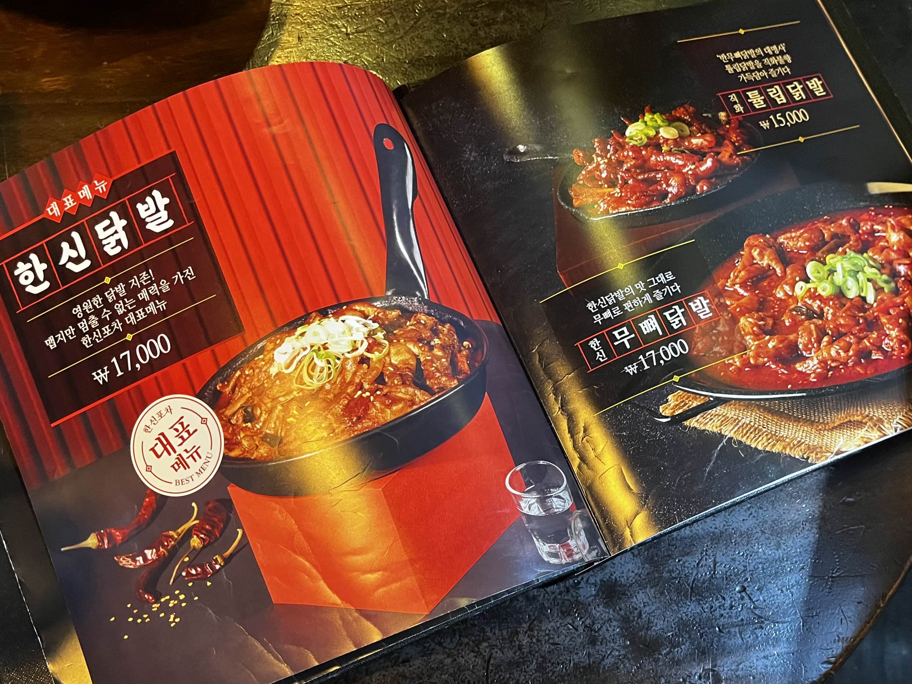 역시 대표 메뉴인 국물 닭발, 한신 닭발이 메뉴판 1면을 장식함