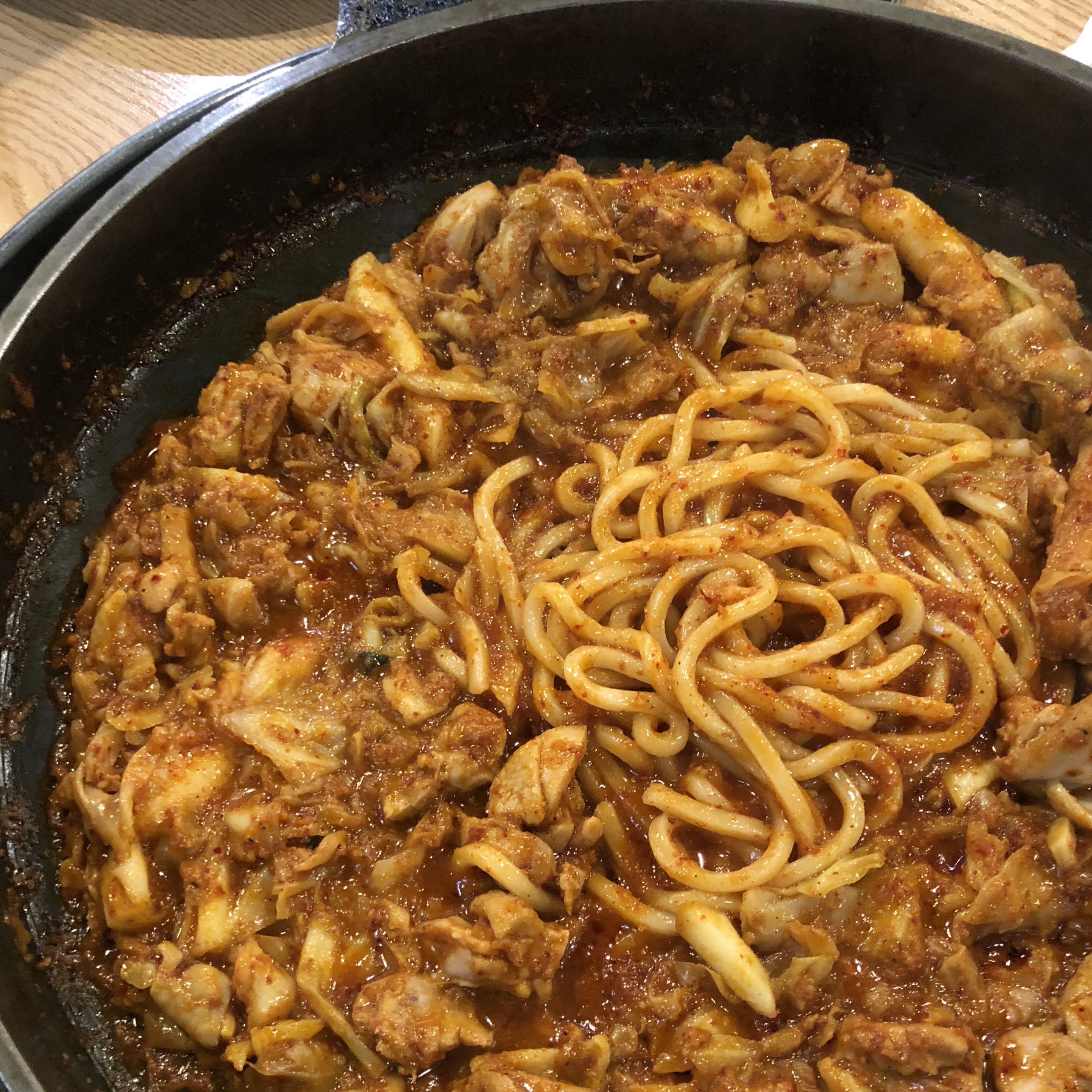 잘 삶아진 말랑한 우동 면발에 진하고 맛있는 닭갈비 양념이 촉촉하게 스며든 맛 😋