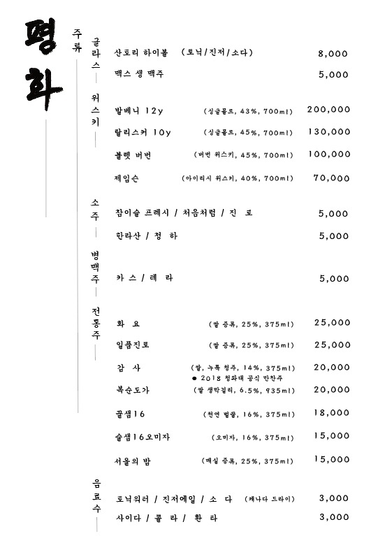 요리 '주점'인 만큼 아주 다양한 주류 메뉴를 취급하는 평화 💛