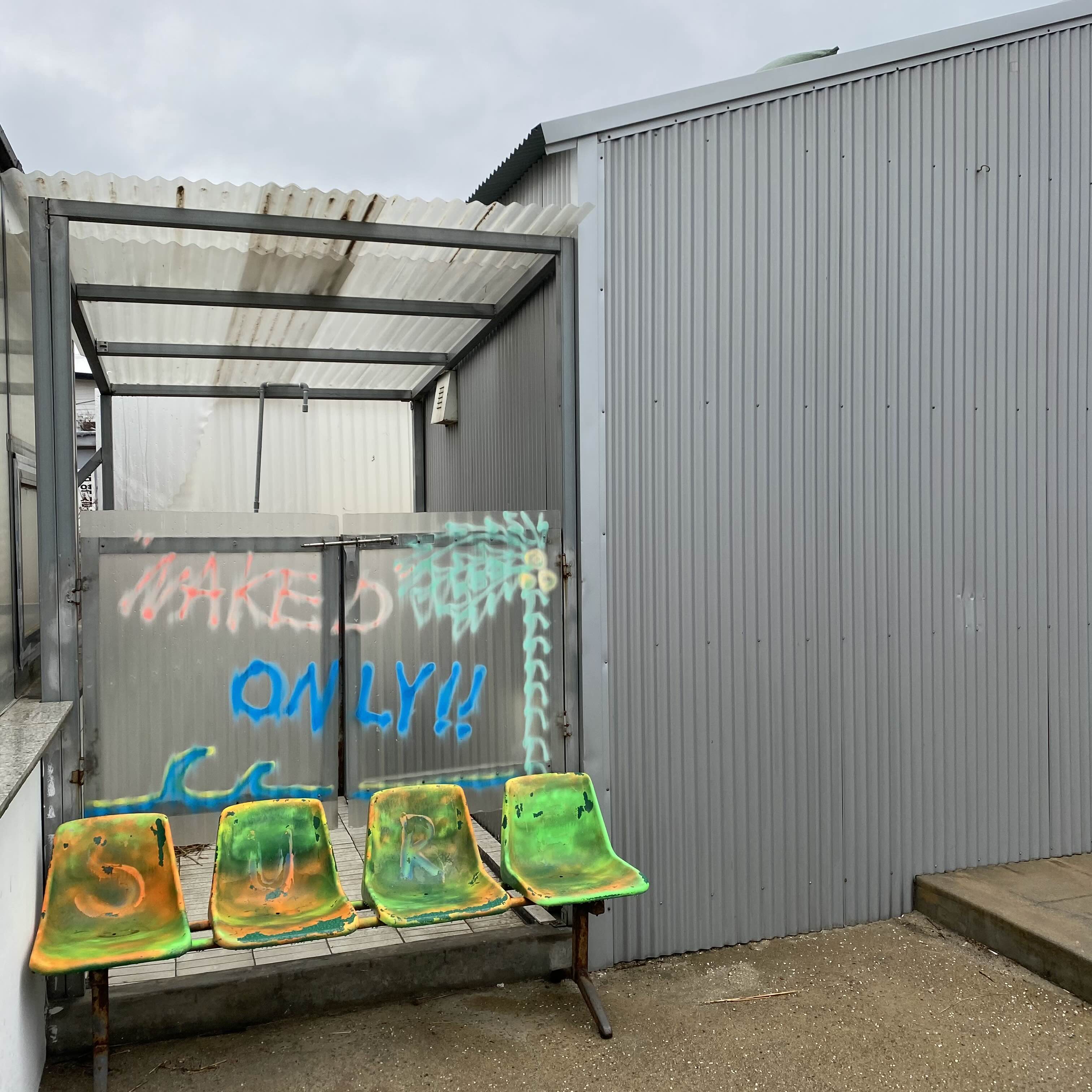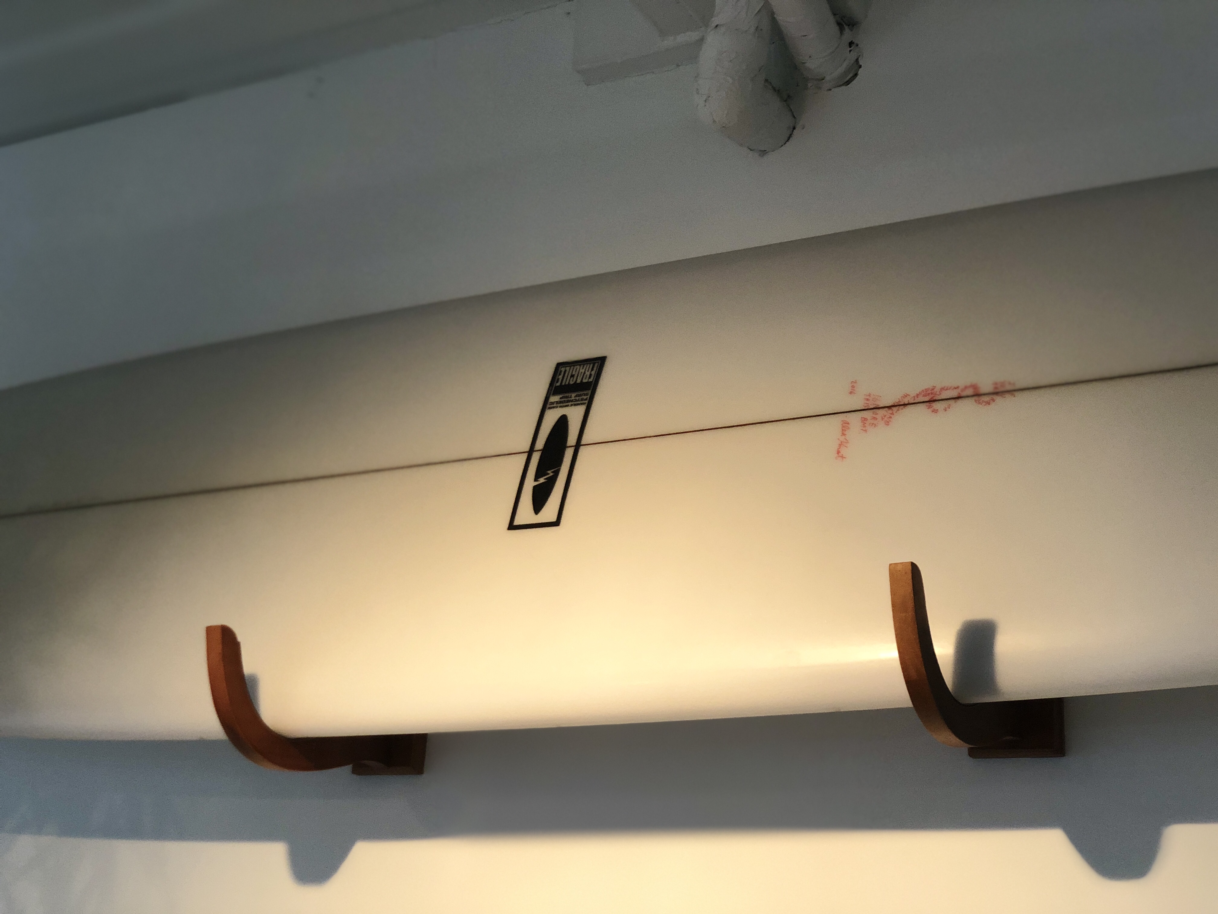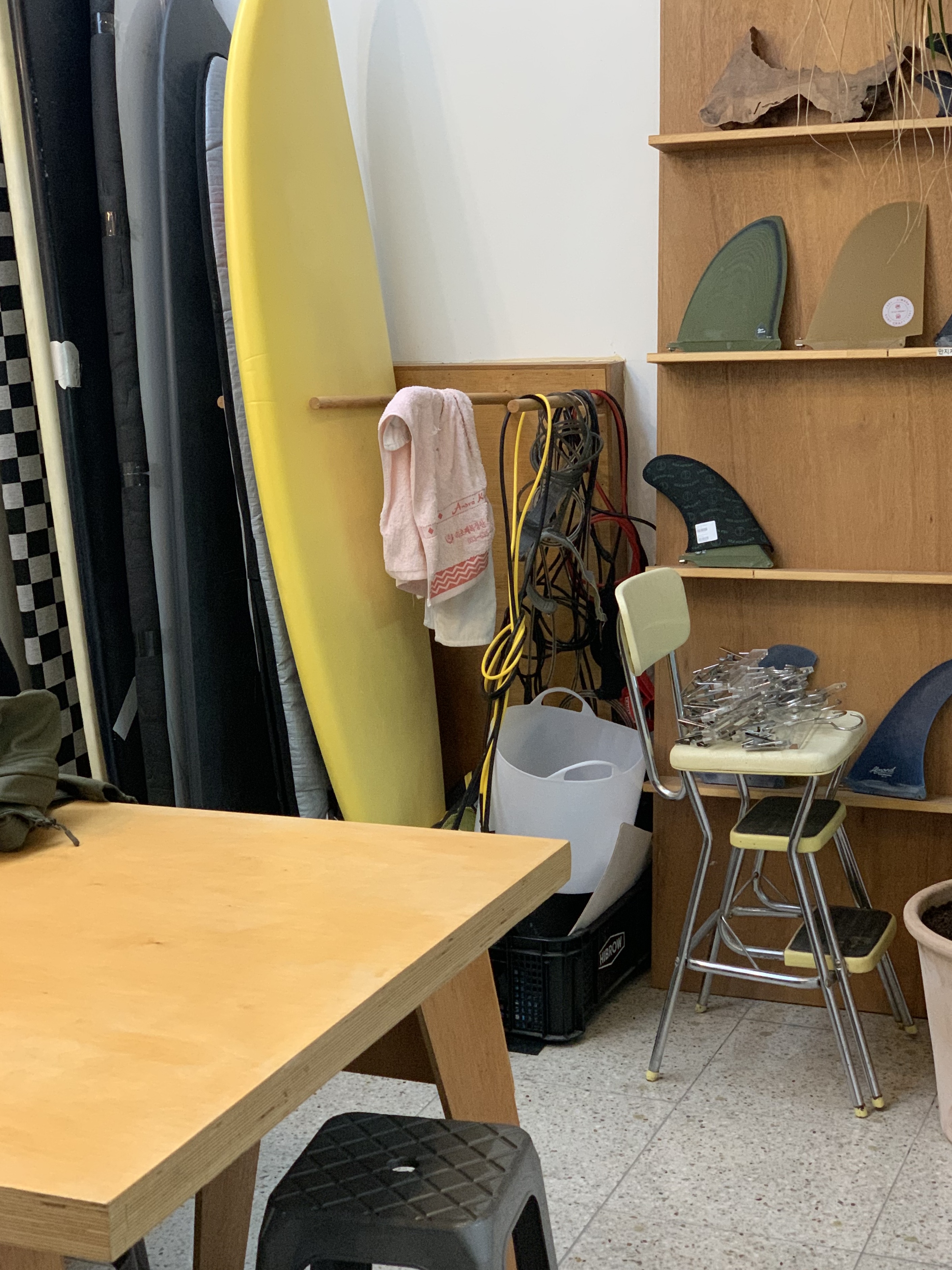 서핑 보드가 걸려있는 가장 안쪽 벽과 그 주변 공간들은
