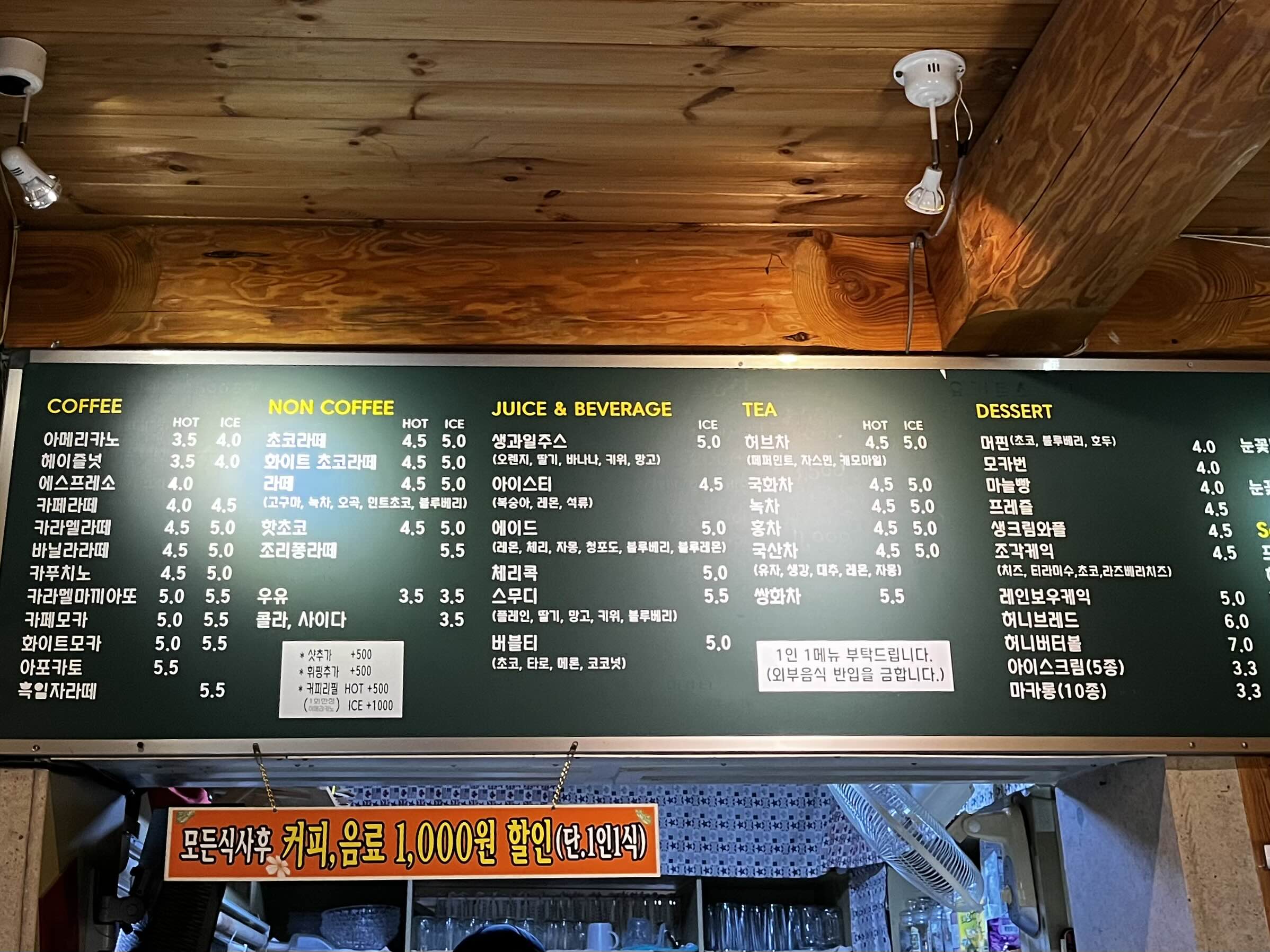 ※ 식사 종류로 1인 1 메뉴를 주문할 경우, 모든 커피와 음료 메뉴는 1,000원씩 할인된다고 해요 ※