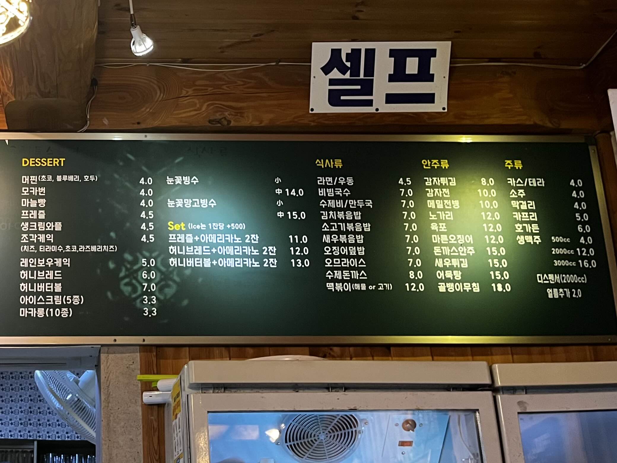 음료뿐만 아니라 다양한 디저트 종류들, 빙수, 그리고 식사와 안주, 주류까지!