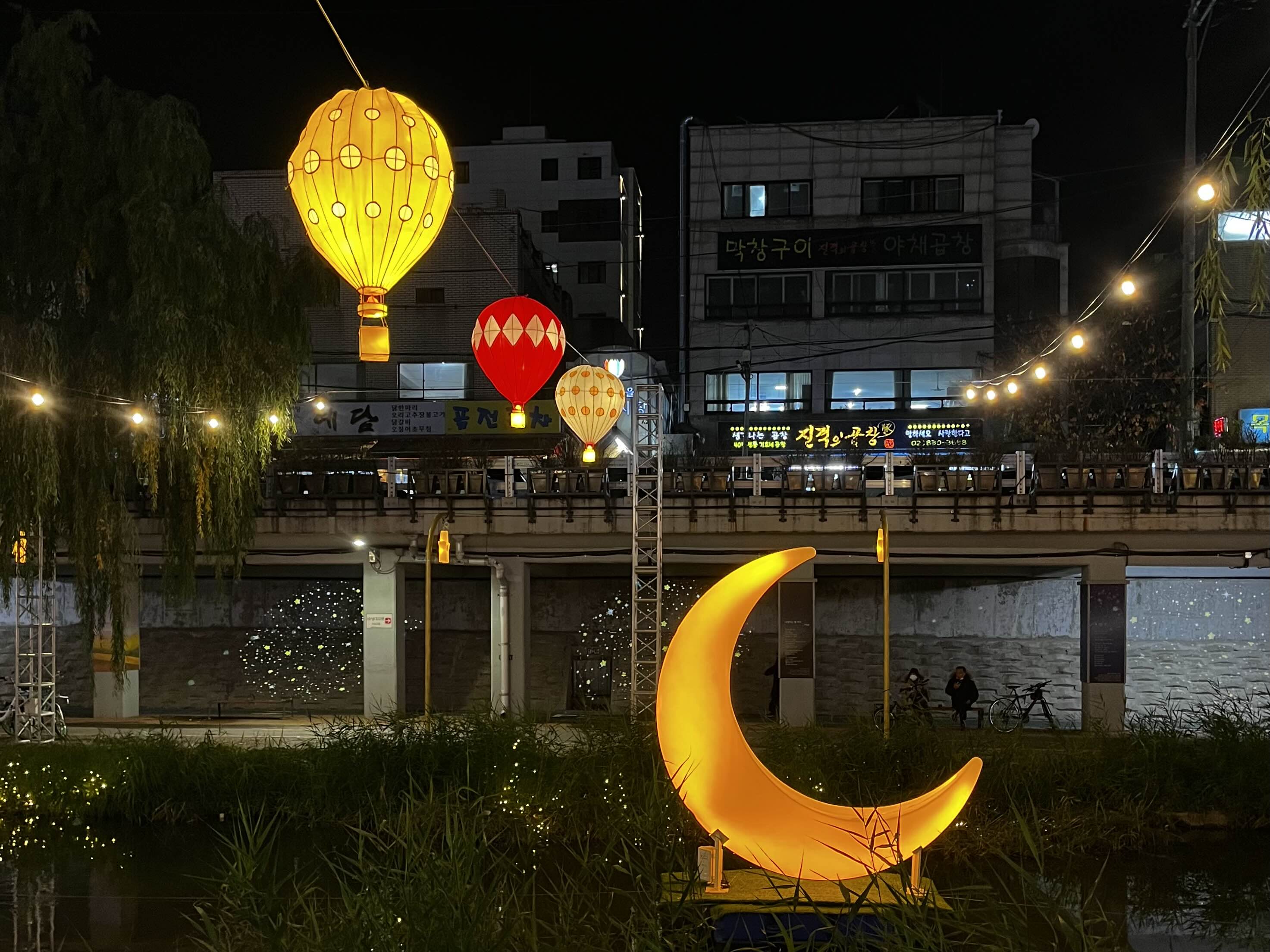 도림천의 랜드마크인 커다랗고 늘어진 나무들, 화려한 여러 조명들이 잘 어우러지는 분위기였어요
