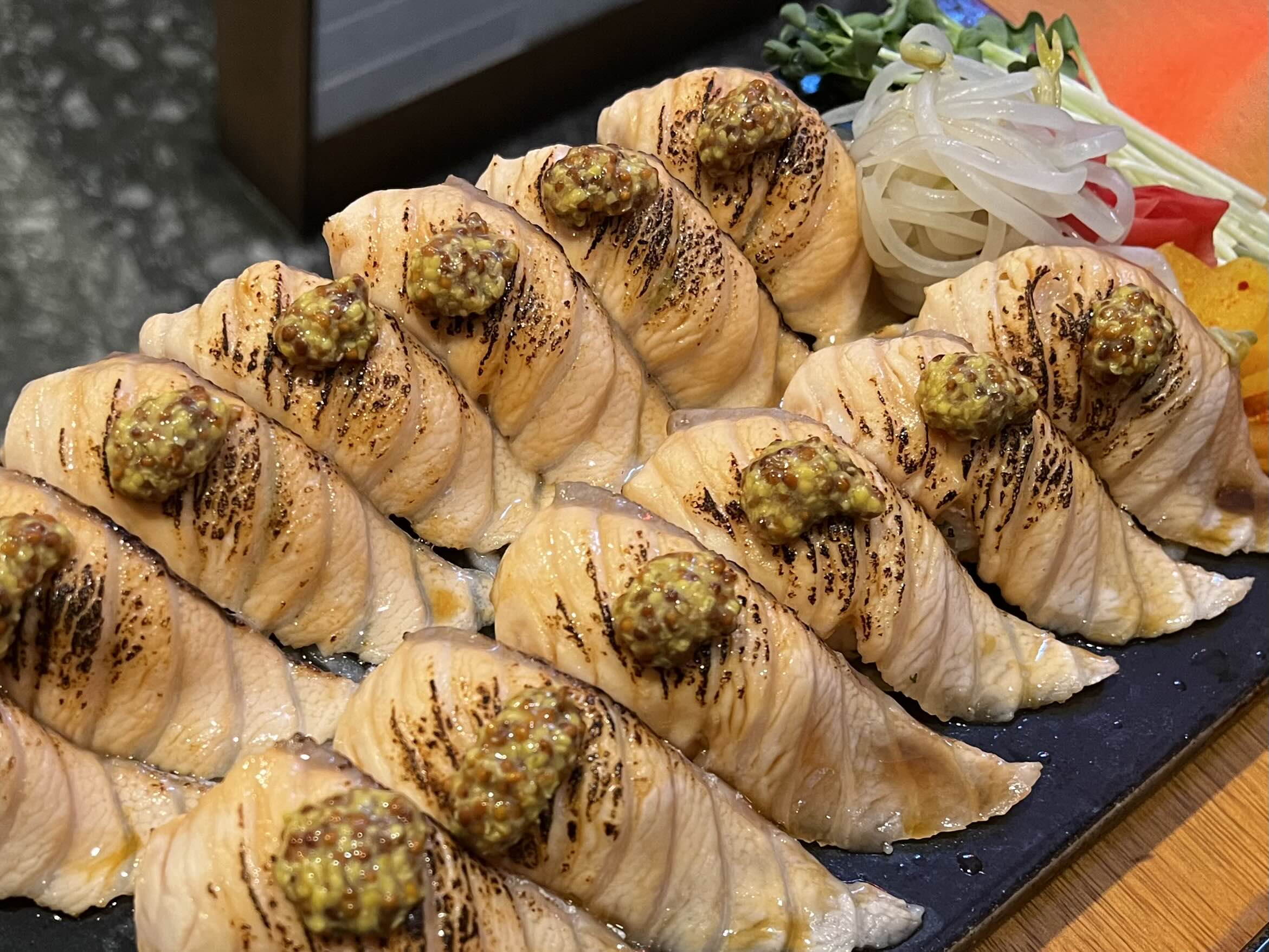 그리고 불맛을 살린 후 홀그레인 머스터드를 곁들인 연어 불초밥이에요 🍣🔥